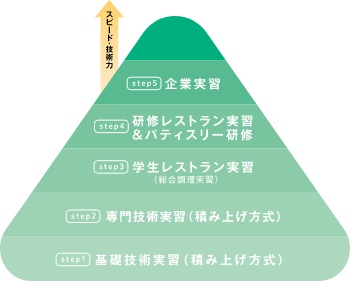 本校独自の技術習得の学習方法です。調理や製菓製パンに必要な技術を一つずつ、反復練習を通して確実にマスターし、次の技術に進む。これを繰り返すことで、自分の上達度を確認しながら、卒業までにすべての学生が、すべての技術をマスターできます。その上で、本校オリジナルの実習教本にそって、実習を重ねることで技術を定着させていきます。そして、総合調理実習、研修レストラン実習、企業実習など、現場に即した様々な実習を学ぶことで、業界に通用する即戦力となる人材を育成します。